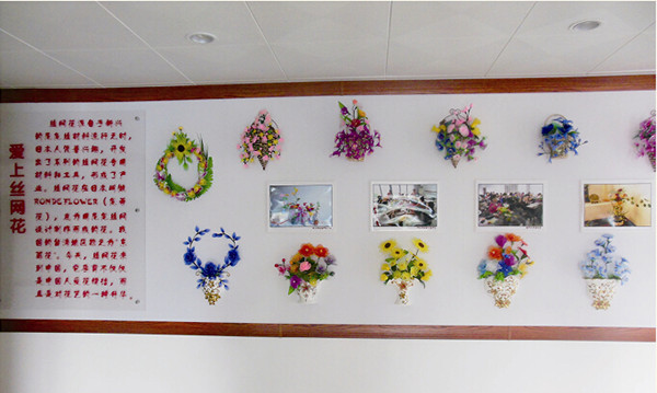 走进三楼,映入眼帘的是丝网花作品展,花红叶绿,鲜艳夺目,几可乱真。你仿佛进入了一个绿色的世界,鲜花的海洋。